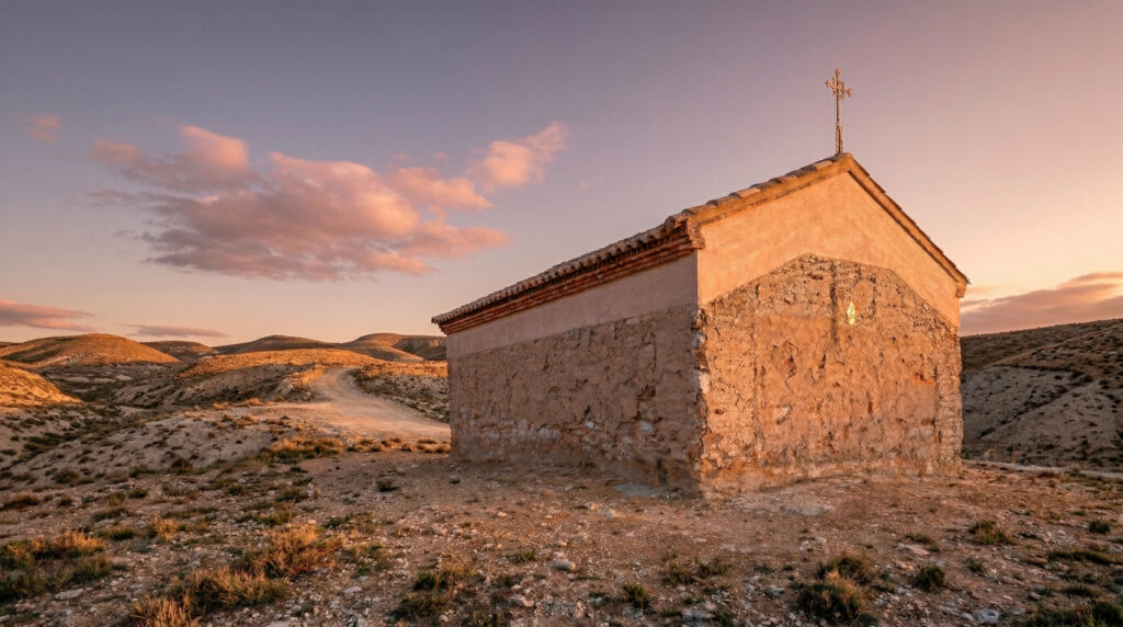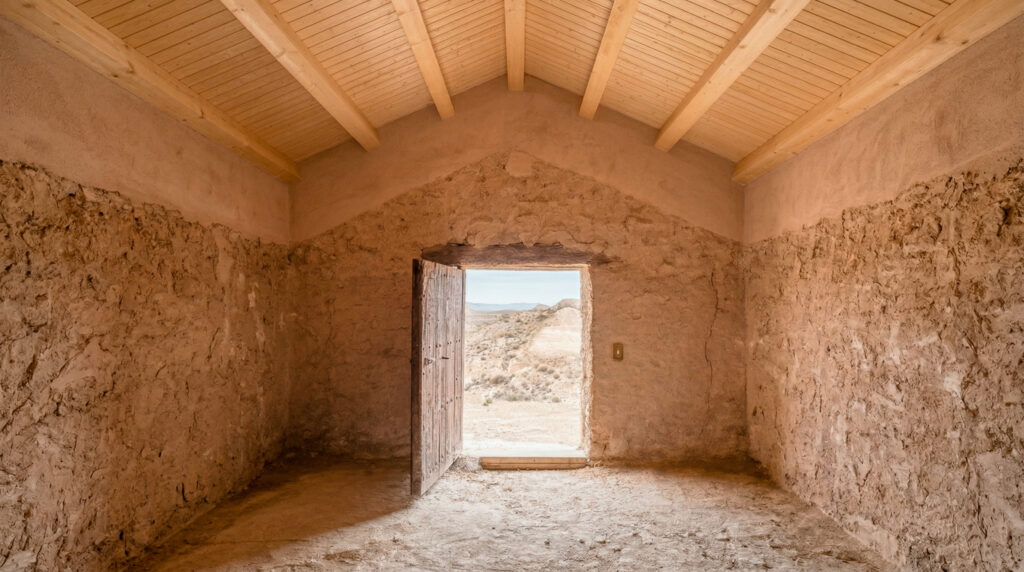 En la ermita, la actuación se centra en la reconstrucción de la cubierta, desaparecida con el paso del tiempo, con el objetivo de proteger el edificio y recuperar su lectura original. La intervención se resuelve mediante el uso de materiales tradicionales, compatibles con la arquitectura existente, manteniendo como criterio principal la conservación de los muros actuales sin revestir, preservando su materialidad y carácter.